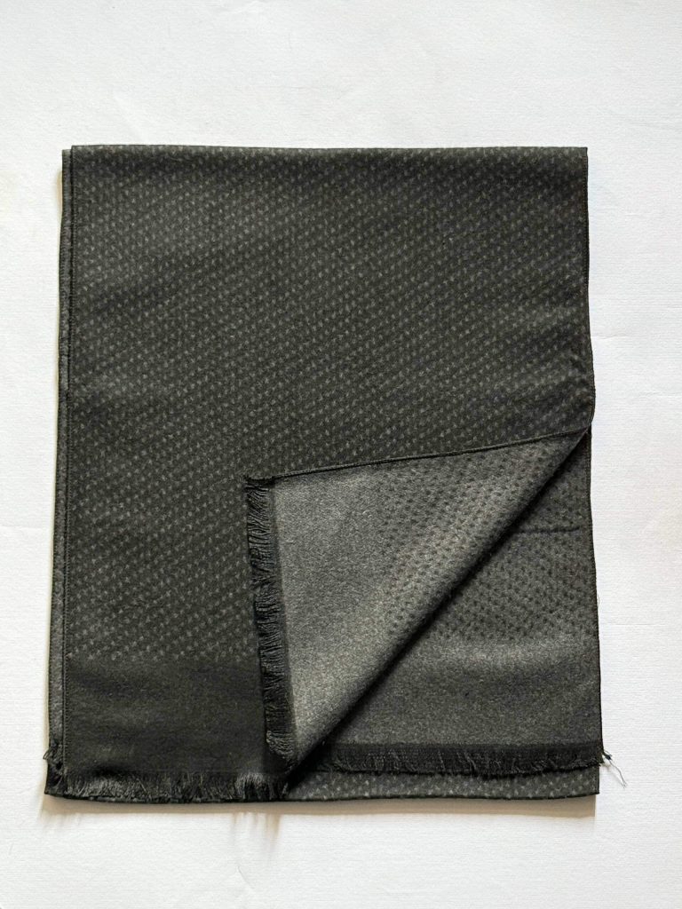 شال پشمی اعلا طرح نقطهای دو رو با رنگ های سرمه ای و طوسی تیره با ته رنگ زیتونی که میتوانید متناسب استایل تان از رنگ سرد و خنثی آن استفاده کنید.